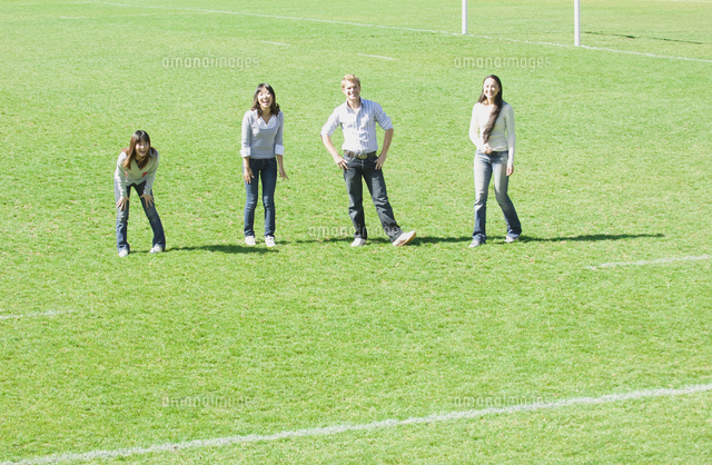 グラウンドに立つ男女4人 の写真素材 イラスト素材 アマナイメージズ